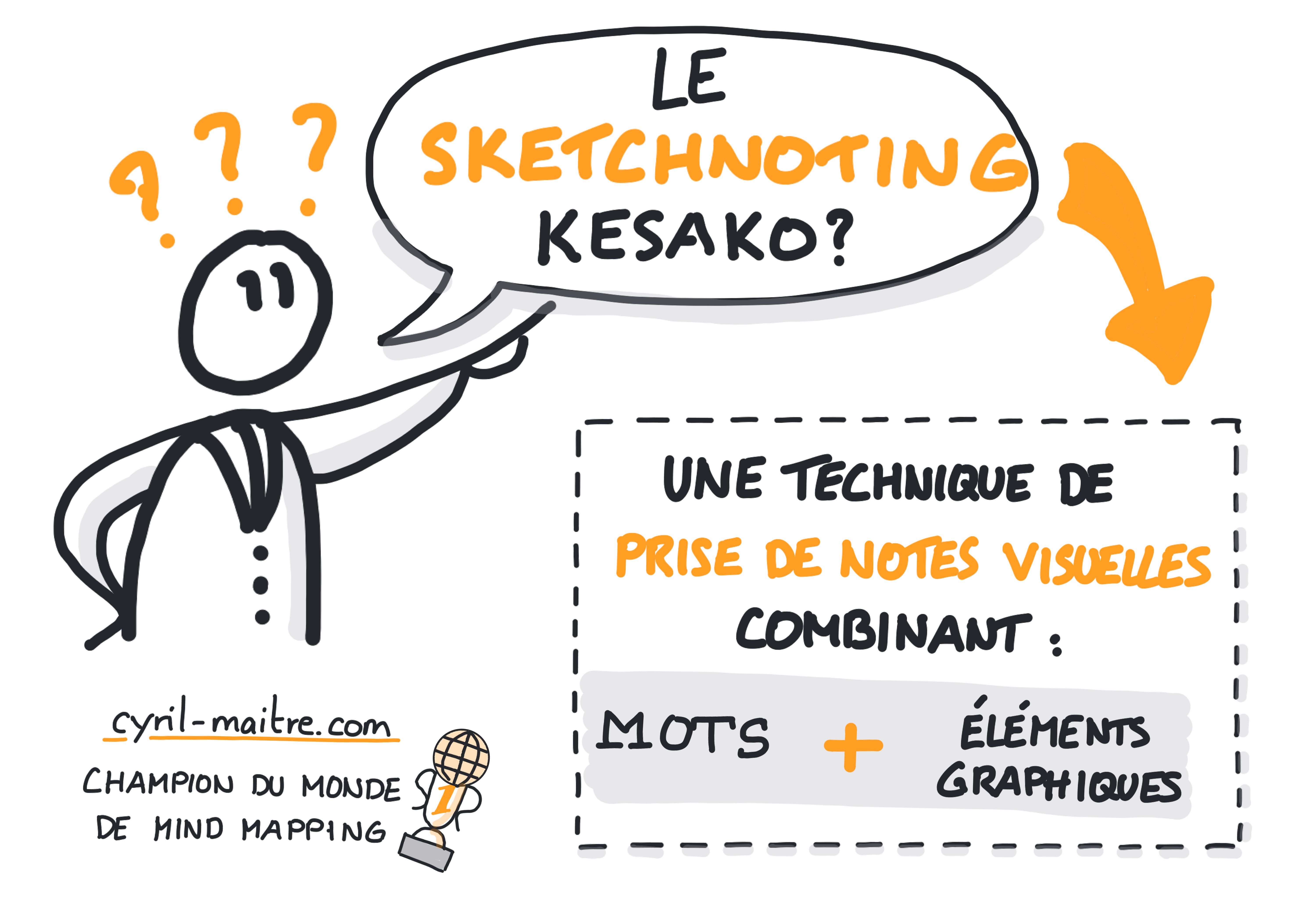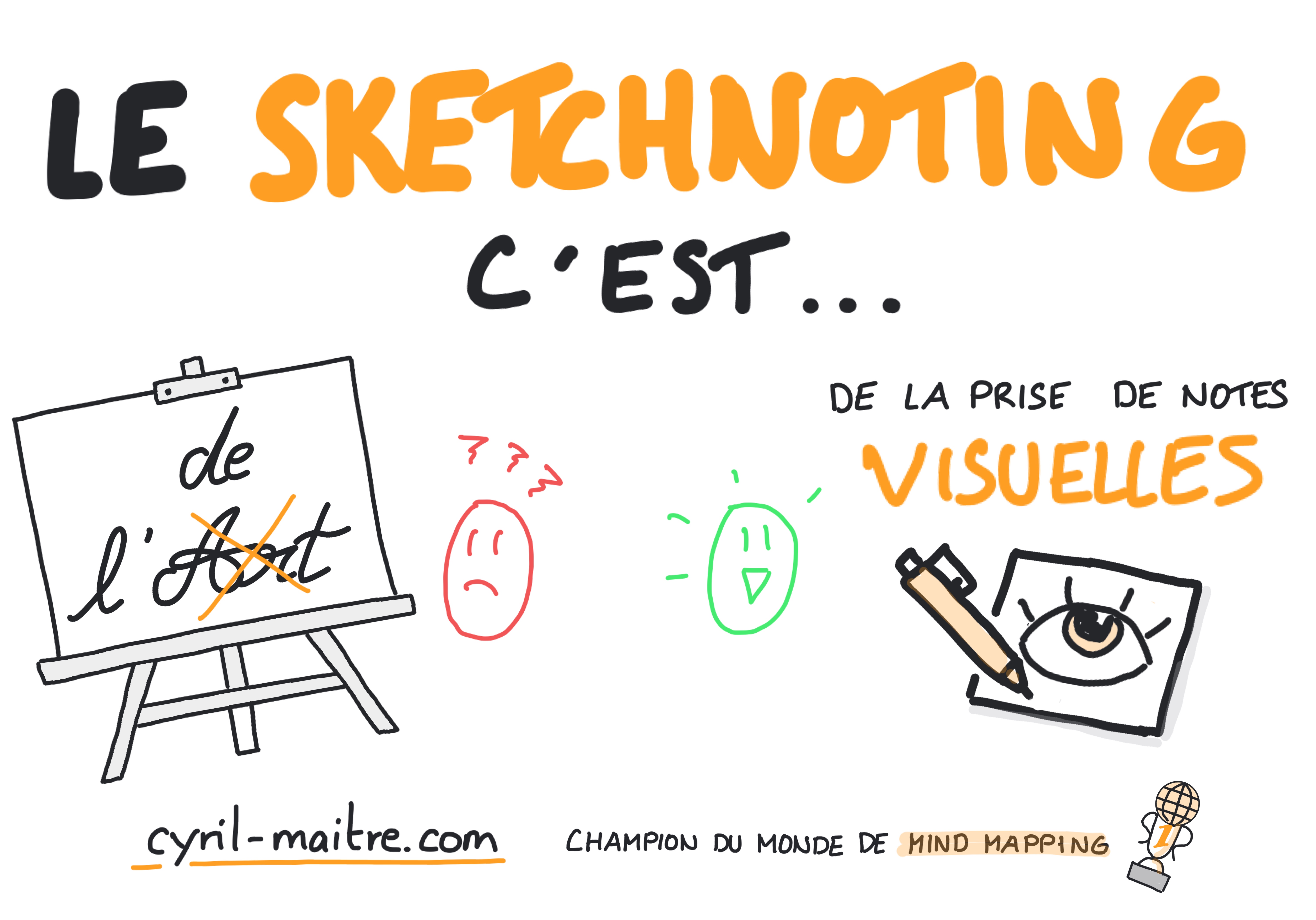 C’est un outil de pensée visuelle qui associe des mots clefs, des pictogrammes et divers éléments graphiques, afin de gérer de l’information de façon efficiente. Cela touche donc de façon évidente à la prise de notes. Mais au-delà, à l’organisation d’idées en vue de produire du contenu (préparation de compte-rendu, discours etc..). Ou encore viser la transmission d’un message, ou bien clarifier et synthétiser la pensée d’un groupe. Le but du jeu étant toujours d’être le plus efficace possible dans le traitement des informations grâce à un outil de pensée visuelle tel que le sketchnote.