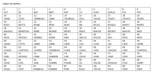 La table de rappel est une extension du code chiffre-lettre. Plus exactement la table de rappel consiste à automatiser ce code chiffre-lettre pour pouvoir l’utiliser très rapidement sans avoir à chercher à chaque fois un mot pour chaque nombre. C’est très utile pour retenir des numéros de téléphone ou des codes secrets par exemple.