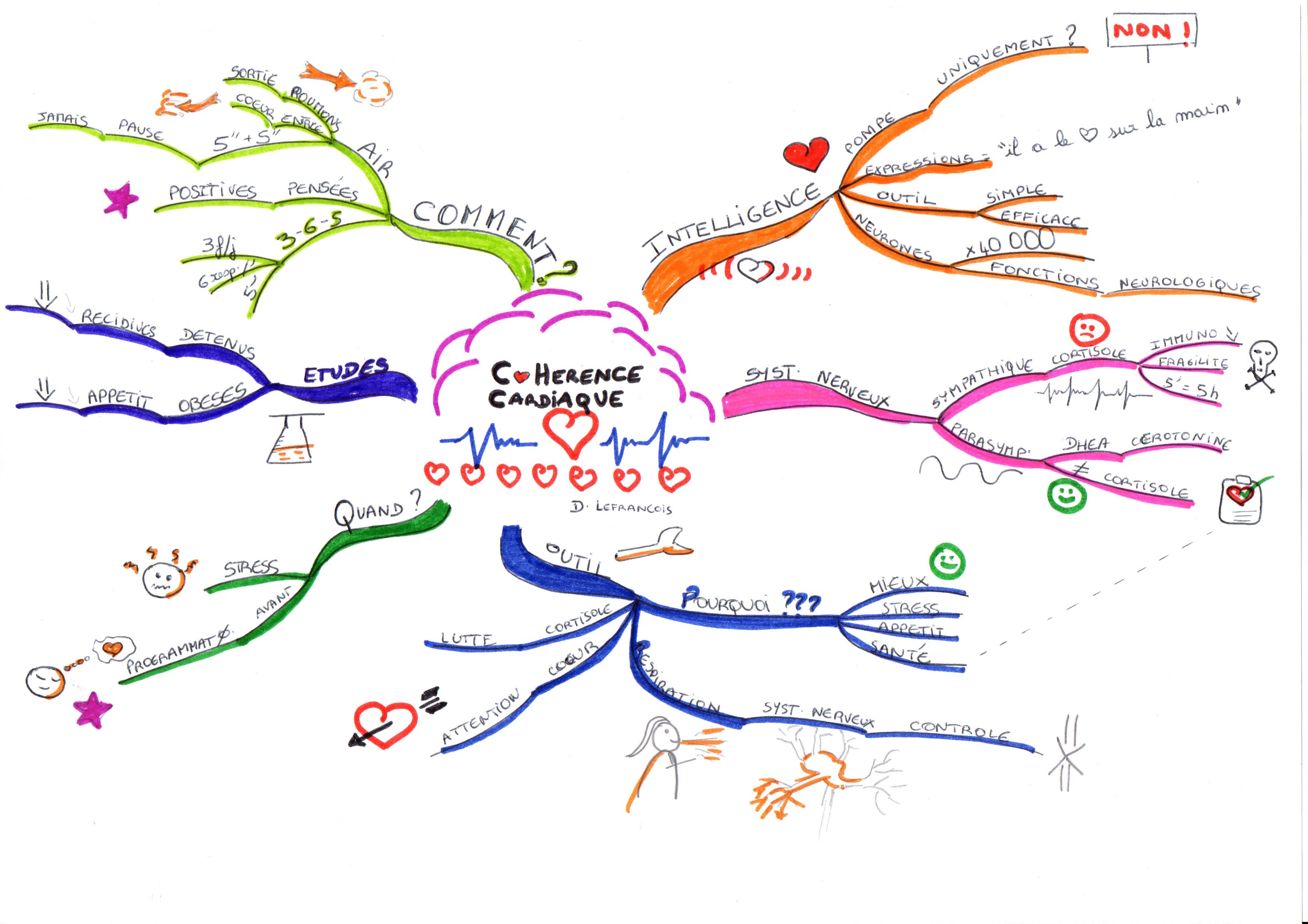 Carte sur la cohérence cardiaque réalisée par Nelly qui a suivi la formation en ligne Les bases du mind mapping. (cliquez sur l'image pour l'agrandir)