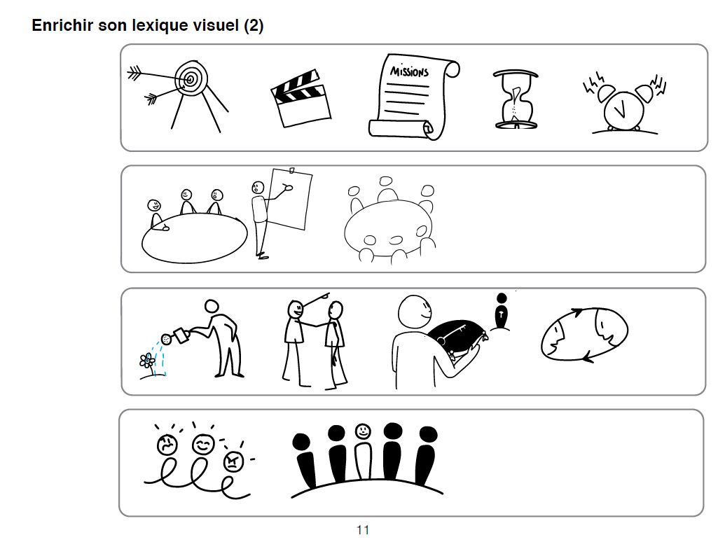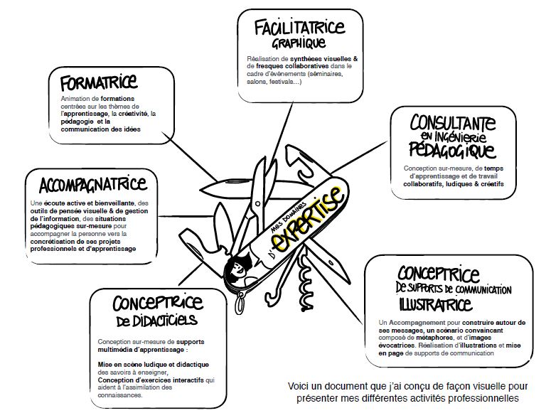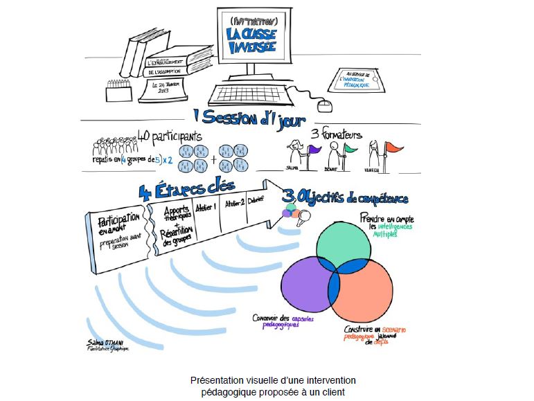Cela n’a rien à voir avec le dessin artistique. Nous avons ensuite mis en pratique ses conseils en dessinant notre vision de notre activité professionnelle. C’est un exercice très intéressant pour clarifier sa pensée, identifier des idées clés et les convertir en dessins ou en pictogrammes. Voici par exemple la présentation de Salma :