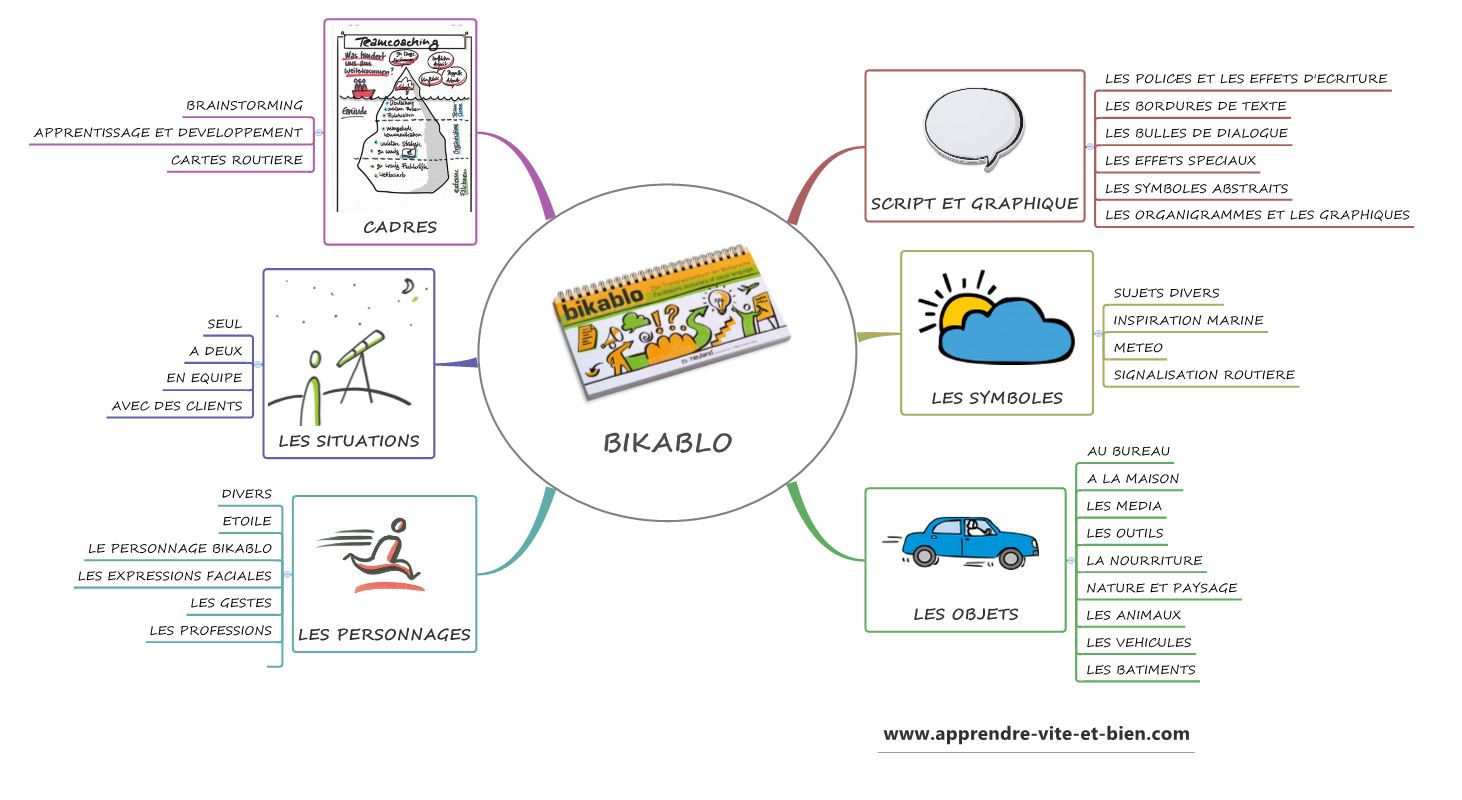 C’est un ouvrage pratico-pratique. Vous n’apprendrez pas toute la théorie et l’histoire de la pensée visuelle. Vous trouverez juste quelques conseils dans l’introduction pour réaliser facilement vos dessins. Ensuite comme tout dictionnaire, vous avez une liste de mots. Mais à la place d’une définition, vous trouverez un renvoi vers une page présentant la représentation graphique de ce mot. C’est simple et efficace. Le vocabulaire du langage visuel, comme tout vocabulaire d’une langue étrangère ça s’apprend et ça se pratique. C’est là que BIKABLO fait fort. Le livre est composé de 6 parties pour apprendre les dessins par thèmes. Et chacune de ces 6 parties est subdivisée en sous-parties. Chaque page en format paysage présente plusieurs dessins à reproduire. Voici le plan du livre sous forme de mind map. Cliquez sur l’image pour l’agrandir.