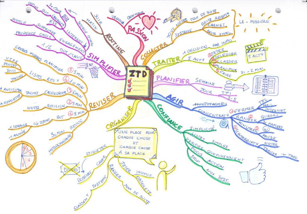 Je vais commencer avec une carte globale de la méthode de productivité Zen to done de Léo Babauta que j'ai déjà présentée plusieurs fois sur le blog. Je vous rappelle que vous pouvez lire sur ce site la traduction du livre de Léo Babauta expliquant pas à pas sa méthode.