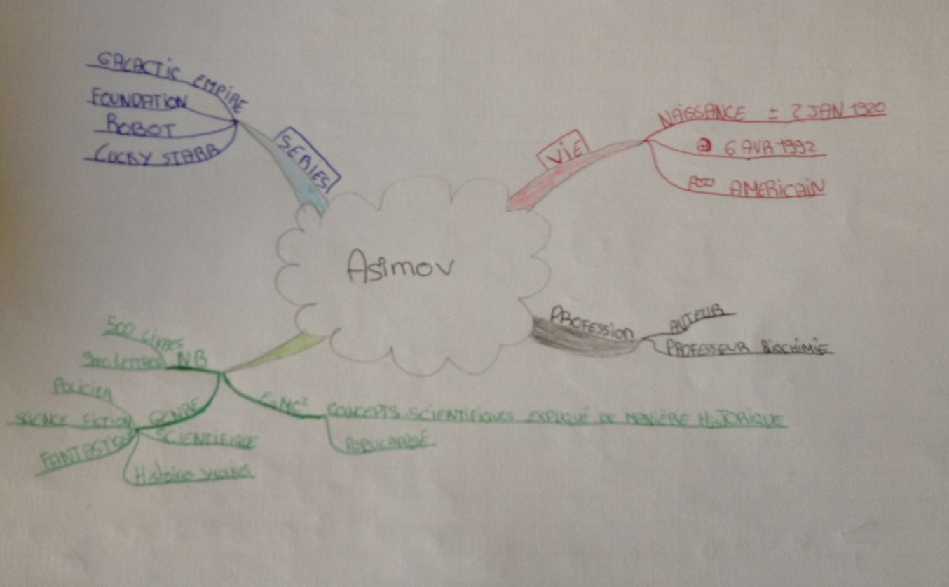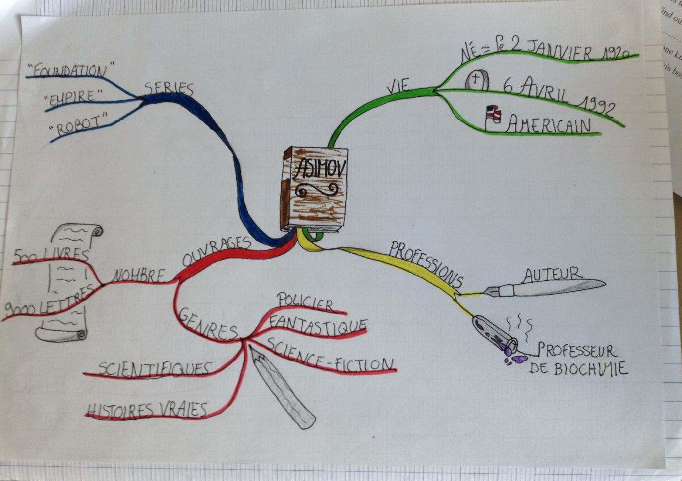 Bonjour Cyril,J'ai suivi ta formation au mindmapping au collège de Cordemais, où je suis prof d'anglais.J’ai commencé à utiliser les cartes mentales avec mes élèves de troisième, sur un travail de compréhension écrite : la biographie d’Asimov.Pour les 3e Euro, qui sont plutôt performants, il a fallu 3 heures pour réaliser la carte mentale et leur faire comprendre son utilité, notamment en termes de possibilités pour la préparation d’un oral d’histoire des arts.Lors de la séquence d’introduction, chaque élève a reçu un texte avec des questions de compréhension écrite (format classique, s’il en est). Les élèves ont dû lire les questions et les regrouper en 4 catégories que j’avais définies : la vie d’Asimov, sa profession, ses ouvrages et les séries qu’il a écrites. Ils ont attribué une couleur à chaque catégorie et nous avons pu dessiner un cœur de carte avec les 4 branches principales. Ils ont pu commencer le repérage dans le texte avec les couleurs.Au cours suivant, ils ont repris les informations en groupe et dessiné sur une feuille A3 la carte mentale de la biographie d’Asimov, avec les informations qu’ils avaient glanées dans le texte. Nous avons ensuite répondu aux questions qui se trouvaient sous le texte et les élèves ont dû corriger leurs cartes mentales faites en groupe. Leur travail pour le cours suivant était d’en refaire une en couleur sur une feuille A4 blanche (fournie par mes soins) à l’aide des informations récoltées et de la carte faite en classe.Au troisième cours, nous avons repris la carte à faire à la maison ensemble et j’ai ajouté des pictogrammes (où j’arrivais à en dessiner) et je les ai encouragés à en ajouter s’ils savaient dessiner, en leur expliquant l’intérêt des images pour la carte mentale, tout comme celui des couleurs.Un peu plus tard, je compte leur faire reprendre l’exposé qu’ils m’ont tous fait sur un président Américain de leur choix : ils devront préparer une carte mentale de leur exposé et le refaire en classe avec leur carte pour seule aide. Je les laisse digérer la première…Les élèves étaient un peu rétifs au début et il a fallu beaucoup d’explications et de patience pour qu’ils entrevoient les possibilités des cartes mentales. Nous en ferons d’autres, guidées également pour qu’ils s’approprient le concept un peu plus. Je commence le même travail avec ma deuxième classe de 3e la semaine prochaine.A bientôt, j'espère.Gaëlle Bourguet