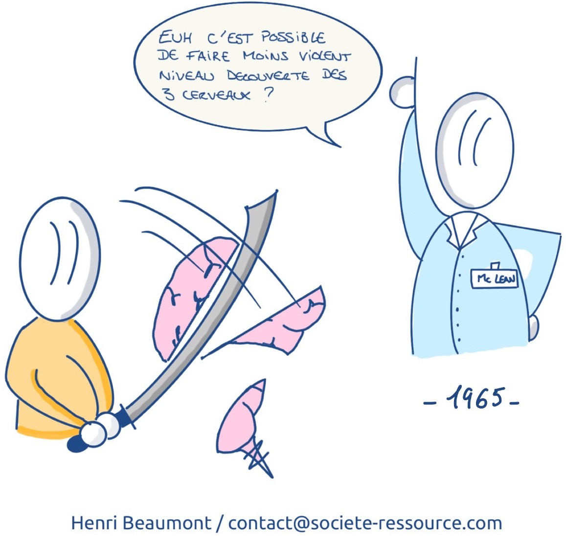En 1965, le neurologue R. Sperry sépare les 2 hémisphères d’un patient. Il constate alors que les hémisphères se comportent comme des frères ennemis. Trois ans plus tard, un autre neurologue P.D. MacLean, observe grâce aux nouvelles techniques d’imagerie médicale que le cerveau est constitué de 3 parties superposées. Il nomme alors sa découverte The Triune-Brain, le cerveau triunique.