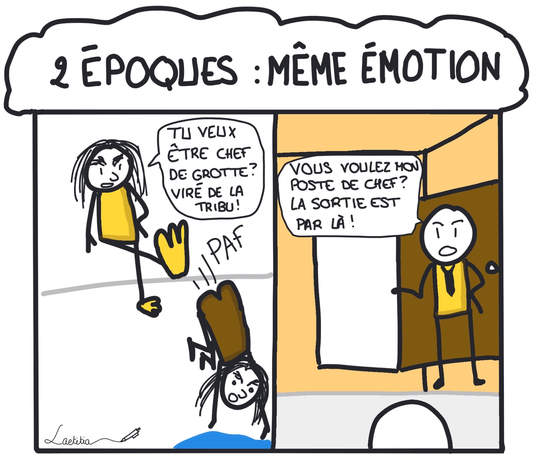 Des « hommes des cavernes » aux « hommes des bureaux », tous doivent faire appel aux émotions. D’une part pour se guider, et d’autre part pour redécouvrir le sens de la vie. Les tigres qui vous pourchassent pour leur quatre heure sont de plus en plus rares et votre vie n’est plus en danger continuellement. Mais vos réactions physiologiques ont traversé les époques et sont les mêmes aujourd’hui qu’il y a bien des années. En situation de peur votre cœur accélère, certains de vos muscles se contractent. Une envie de fuir peut s’emparer de vous. Votre regard et toute l’expression de votre visage peut changer en une fraction de seconde sous le coup du stress Tout comme si cet ancien tigre géant se retrouvait vraiment en face de vous. D’une manière similaire, la colère vous indique les obstacles à surmonter. Ceux face auxquels vous devez vous révéler.