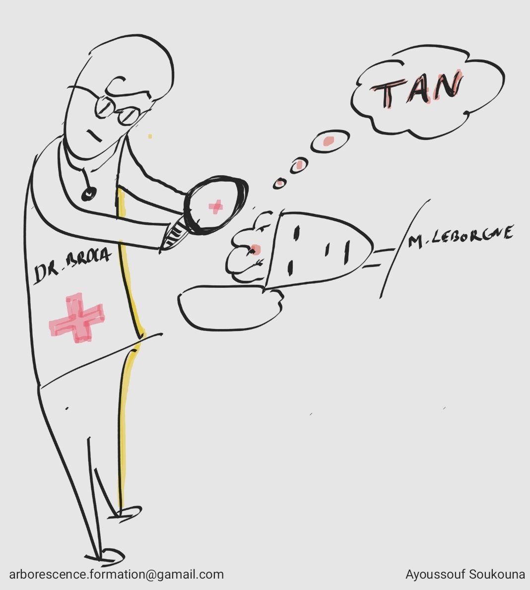 Le docteur Paul Broca (1824-1880) avait un patient baptisé « Tan ». M. Leborgne de son vrai nom. Ce patient devait son surnom « Tan » au fait qu’il s’agissait du seul son qu’il était capable de produire. Après sa mort, le docteur Broca a découvert que ce patient avait une blessure au cerveau. Plus précisément au sein du lobe frontal gauche. Cette lésion l’empêchait de prononcer un seul mot. La zone mise en évidence fut renommée « zone de Broca ».