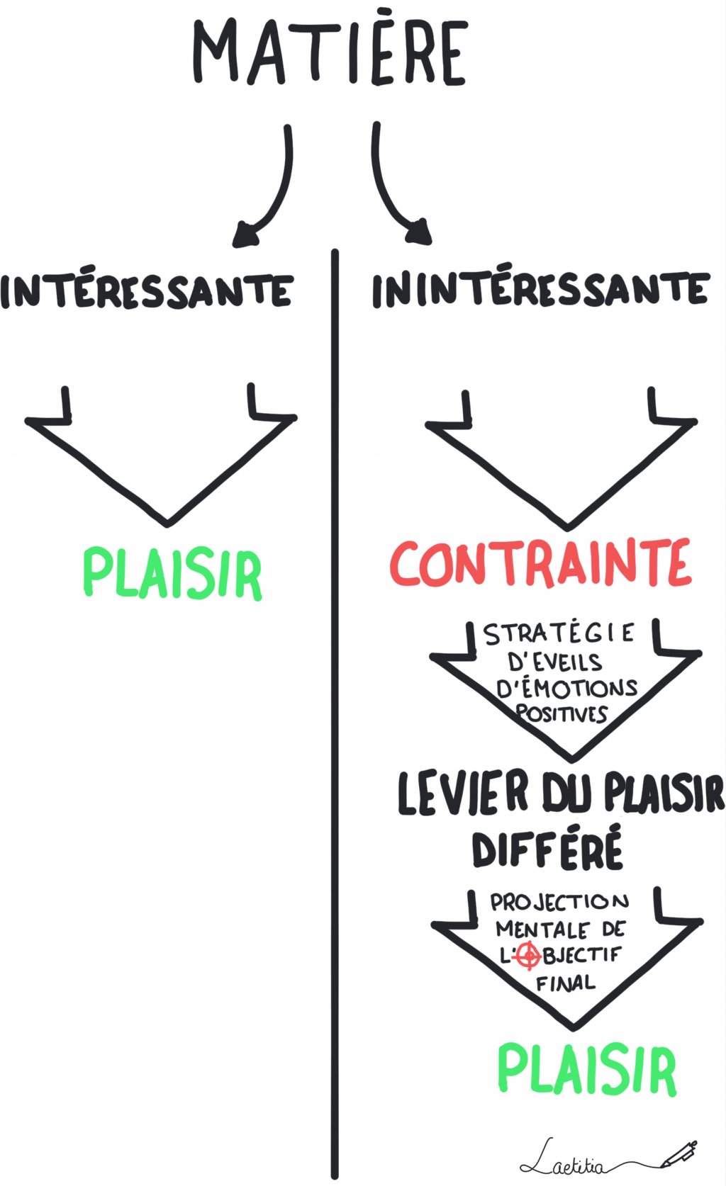 Si le sujet ne vous intéresse absolument pas, il faut savoir appliquer de bonnes stratégies pour éveiller des émotions positives qui porteront vos efforts. Le principe est d’utiliser le levier du plaisir différé. Il vous suffit pour cela de vous décoller de la situation présente qui ne vous motive guère et de vous projeter dans le futur, lorsque vous aurez atteint votre résultat final. Imaginez que vous avez atteint votre but et ressentez la joie que vous éprouvez à ce moment. Le ressenti est très important. Cette joie est votre levier émotionnel. Une fois que vous l’avez éveillée, revenez dans le présent et recommencez à apprendre en conservant ce sentiment. Vous verrez qu’il est alors beaucoup plus facile d’apprendre les matières qui paraissent inintéressantes au premier abord.