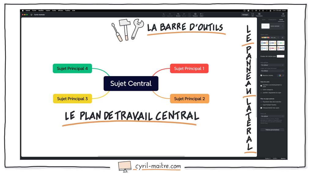Quand tu ouvres XMind pour la première fois, l’interface peut sembler intimidante. Pas de panique ! Tu n’as besoin que de trois zones au début :