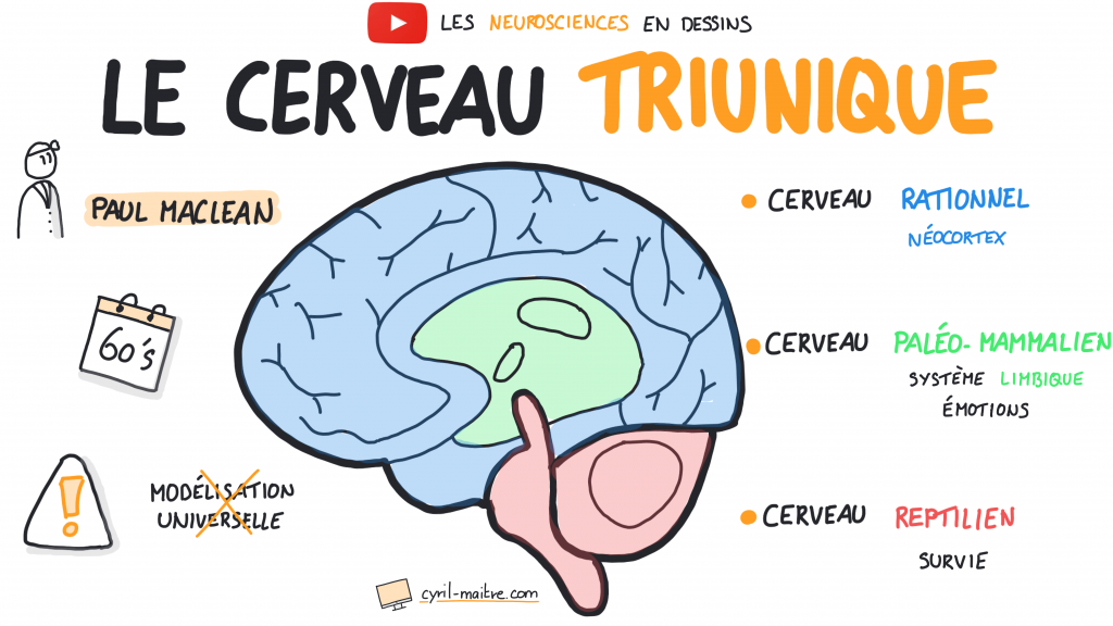 Attention : le cerveau fonctionne comme un réseau intégré où les régions corticales et sous-corticales communiquent en permanence, contrairement à l’idée d’une séparation stricte entre « cerveau rationnel » et « cerveau émotionnel » du modèle triunique de MacLean (obsolète depuis les années 80).