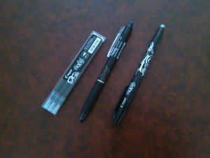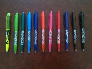 Mon choix s’est arrêté sur les Pilot Frixions. Ce sont de véritables stylos magiques. Leur encre est effaçable grâce à une gomme spéciale qui se trouve au bout du stylo!