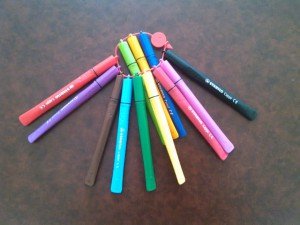 Dans ma pratique, j’utilise les feutres Stabilo Cappi. La spécificité des Cappi est d’être attachés ensemble par le bouchon grâce à un lacet. En plus de les rendre très agréables à l’utilisation, cela supprime le syndrome du feutre séché (car le bouchon a été oublié). J’ai longtemps utilisé la version 12 couleurs qui est très bien adaptée au mind mapping. C’est d’ailleurs la version que j’offre aux participants de mes formations.