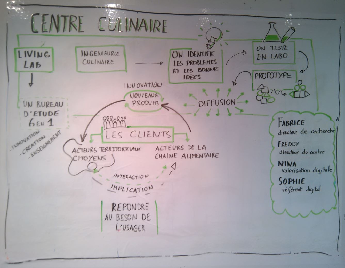 Cette formation a eu lieu à Rennes dans un endroit particulièrement bien choisi : Le Centre Culinaire Contemporain. En plus d’être très agréable, le Centre Culinaire dispose d’un restaurant d’application dans lequel le chef nous a concocté des plats gastronomiques incroyables… Si vous êtes de passage à Rennes, n’hésitez pas à réserver une table, vous ne serez pas déçu. Mais vous n’êtes pas là pour parler nourriture, alors reprenons sur cette formation. Elle était animée par Nicolas Gros et sa collègue Laure Villemaine, tous deux facilitateurs graphiques de haut vol. Et nous étions 10 stagiaires venus d’horizons très divers pour participer à cette session consacrée au scribing.