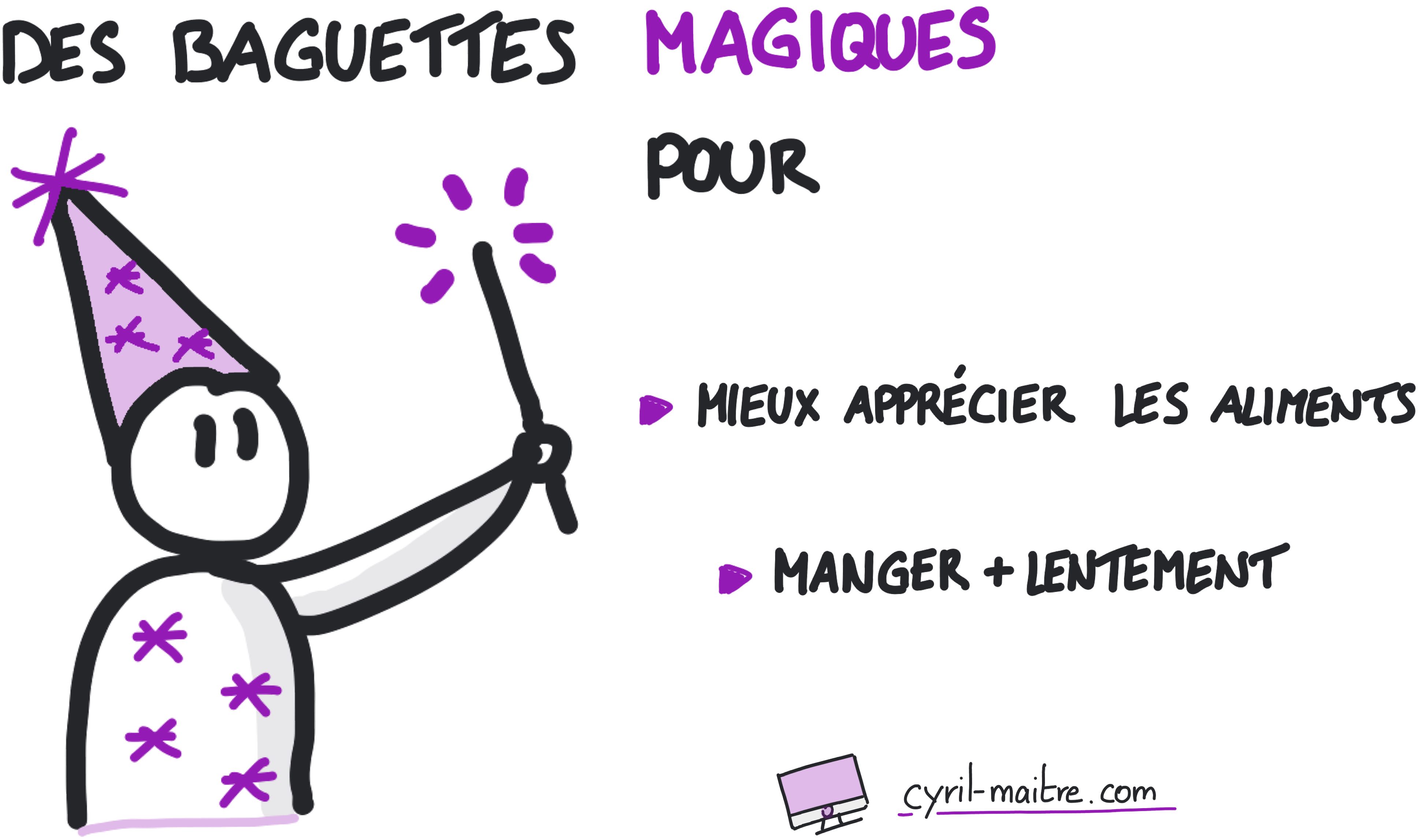Saviez-vous que votre cerveau a besoin de vingt minutes pour se rendre compte que votre corps est rassasié ? La qualité des aliments n’est pas le seul paramètre à prendre en compte lorsque vous vous nourrissez. Le « Quand ? » et le « Comment ? » ont une place tout aussi importante. Vous vous débattez dans votre relation à l’alimentation ? Vous souhaitez retrouver le plaisir et la pleine conscience de vos expériences gastronomiques ? Voici mon conseil pratique : Ranger fourchettes, couteaux et cuillères, et tester les baguettes !